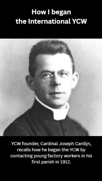 And finally we present an audio extract from Cardijn's talk in Australia in 1966 explaining how he first began to build the YCW in his original parish of Notre Dame at Laeken in 1912.