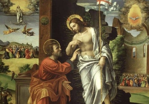 The Gospel account, from the fourth Gospel, is set on two consecutive Sundays, the first is the evening of the day of the resurrection, the second, eight days later. The first scene finds the disciples in hiding for fear that they would suffer the same fate of Jesus, at the hands of the religious authorities.