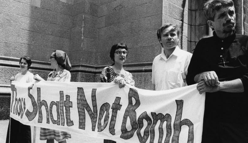 As the war in the Middle East continues unabated, echoing a famous photo of Mobi Warren, Marion Shintel, Merle Ratner, Fr Kenneth Keulman and Dan Berrigan SJ (Religious News Service photo above), Pope Leo has called for a ban on aerial bombing and reiterated his appeal for a ceasefire.