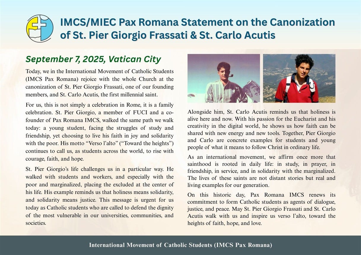 As a corresponding member of Pax Romana, the movement of Catholic students, intellectuals and professionals, to which St Pier Giorgio Frassati once belonged, the Australian Cardijn Institute welcomes his canonisation by Pope Leo XIV on Sunday 7 September 2025 alongside St Carlo Acutis..